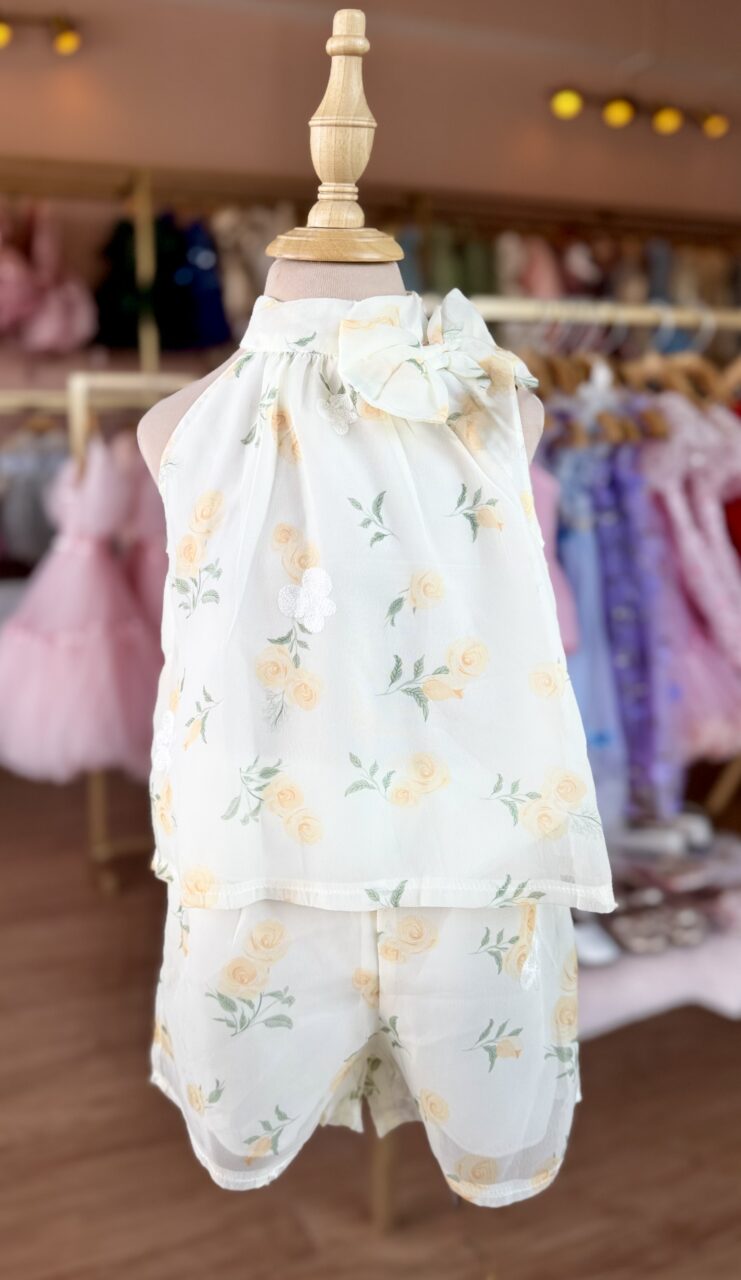 Conjunto encantador de dos piezas con estampado floral en tonos amarillos y delicados bordados. su blusa de caída ligera con delicado lazo al hombro y shot a juego crean un look dulce , fresco y lleno de alegría para tu pequeña.