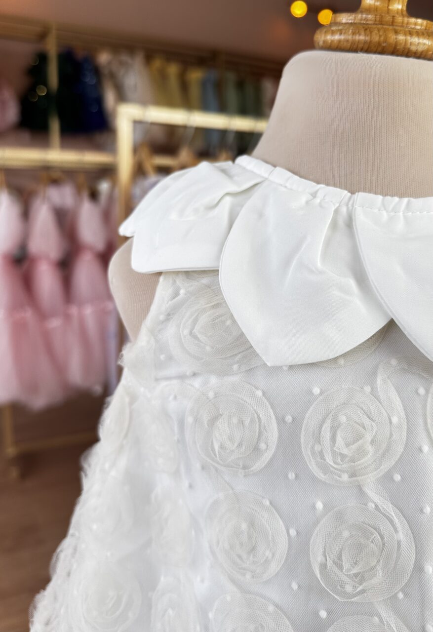 Este encantador vestido blanco destaca por su elegante tela con relieve de flores, que aporta textura y un toque romántico a la prenda. Su delicado cuello, inspirado en la forma de pétalos de flor, enmarca suavemente el escote y añade un detalle femenino y sofisticado.